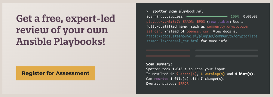 The first step doesn’t have to be a full migration project. Our free Ansible Playbook Assessment gives you a clear picture of where your automation code stands today — what’s broken, what’s at risk, and what can be fixed automatically versus what needs expert attention. Spotter runs entirely on your infrastructure, so no data leaves your premises.