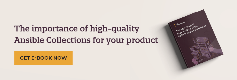 If you are thinking about creating your own Ansible Collection, you can download a free e-book from Steampunk packed full of advice on building and maintaining high-quality Ansible integrations.
