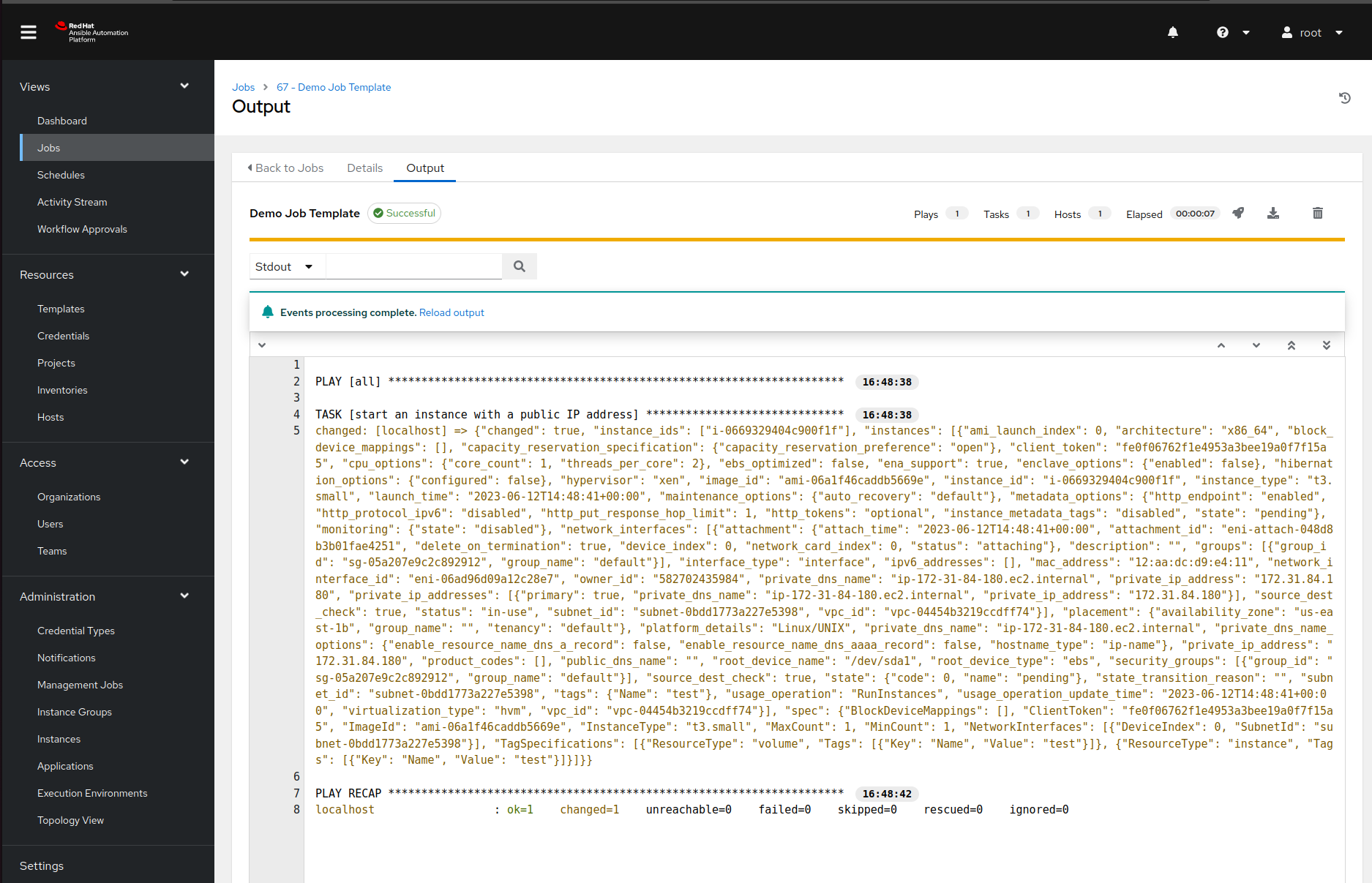 Now it is finally time for the fun part ;) If we now navigate to the templates page and click on a rocket next to our job template, Ansible Automation Platform will pop up a survey we defined earlier. Once we enter all the required data and confirm our choices, Ansible Tower will run the playbook and display the output: