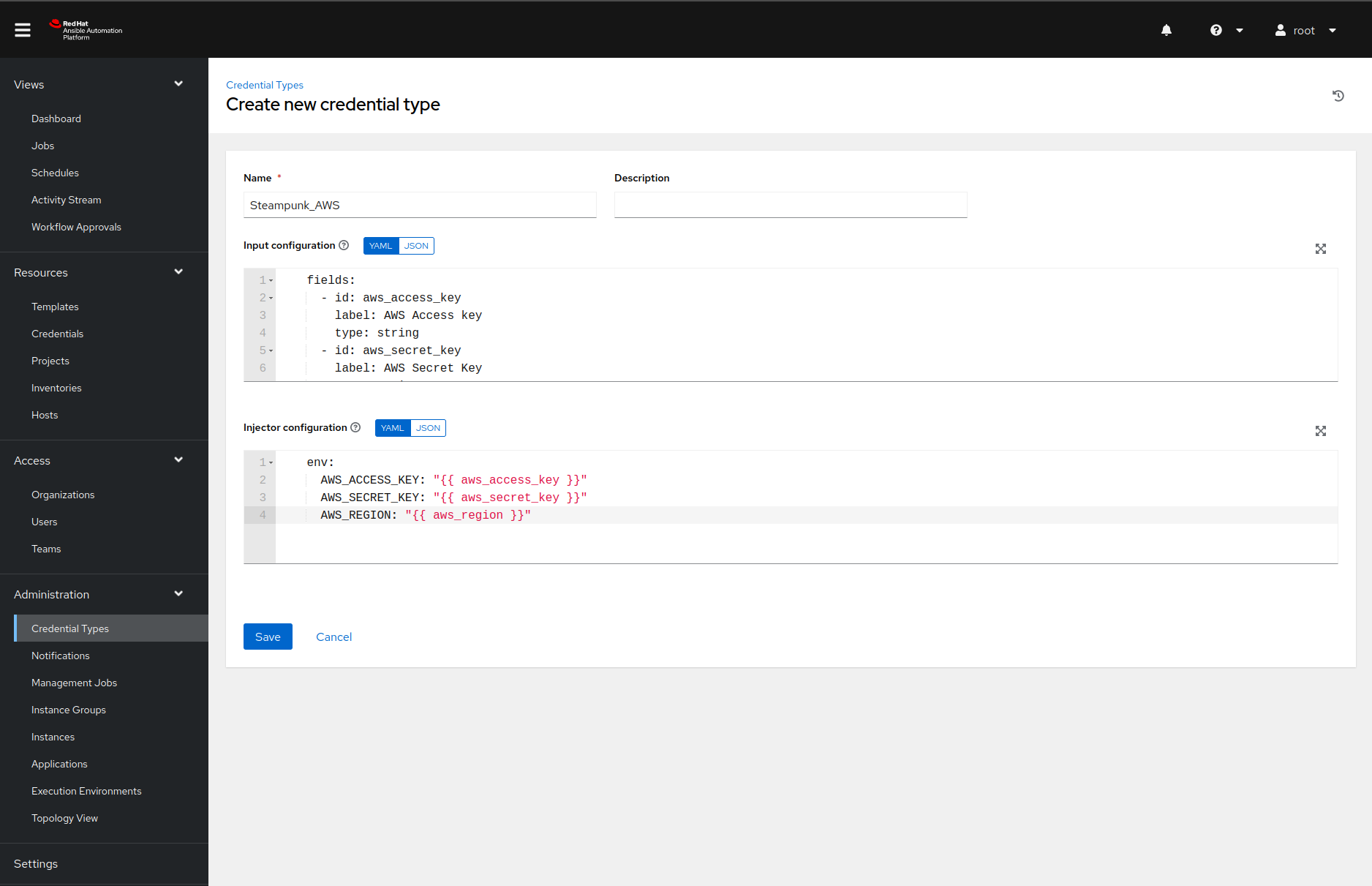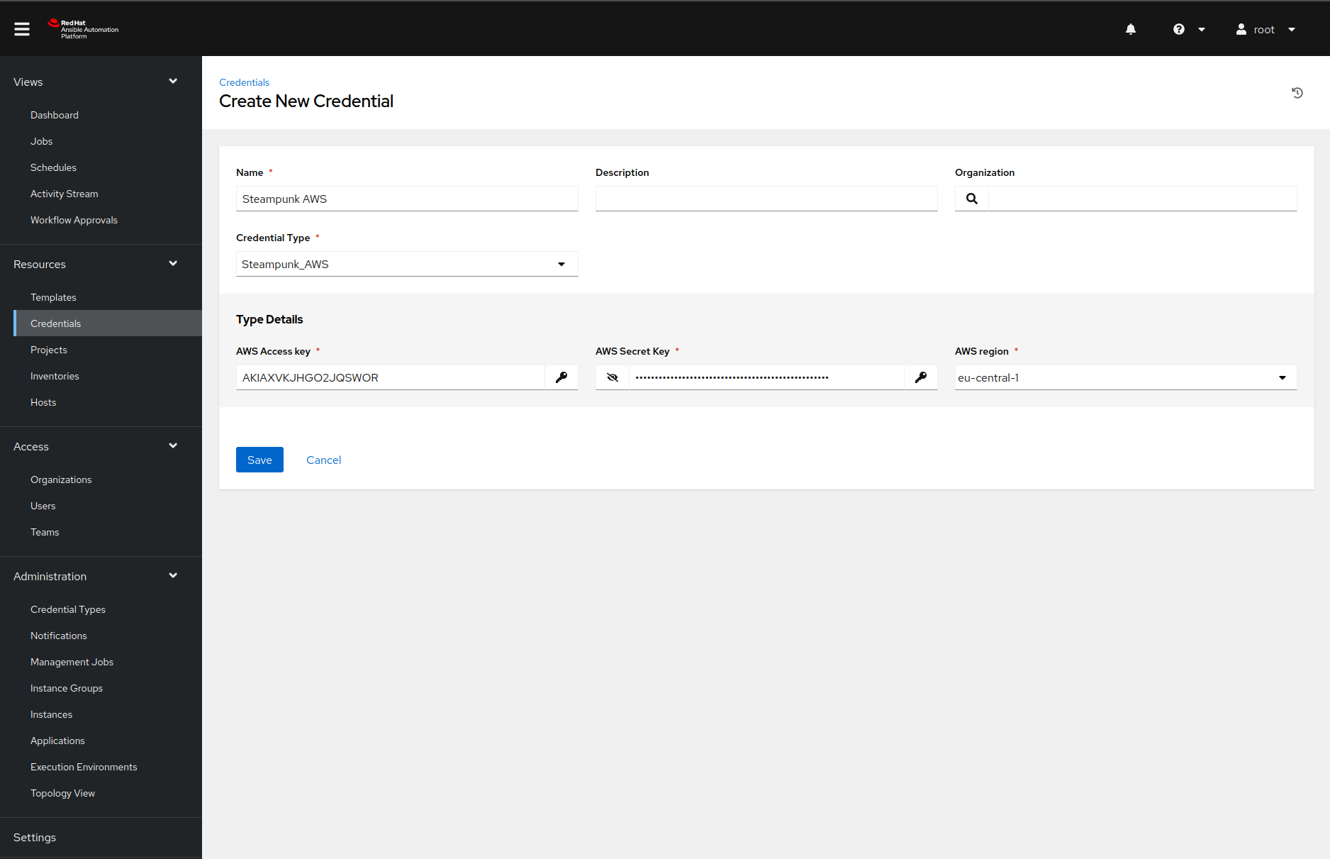 Now that we defined our custom credential type, we can add our AWS credentials to the Ansible Automation Platform. Once we navigate to the Credentials page and click on the Add button, Ansible Automation Platform will present us with the following form: