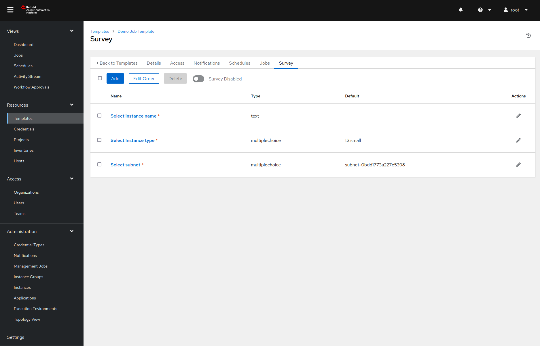 In our example, we created a survey with three prompts. The image below shows how we defined the instance type prompt. The other two prompts were defined similarly.