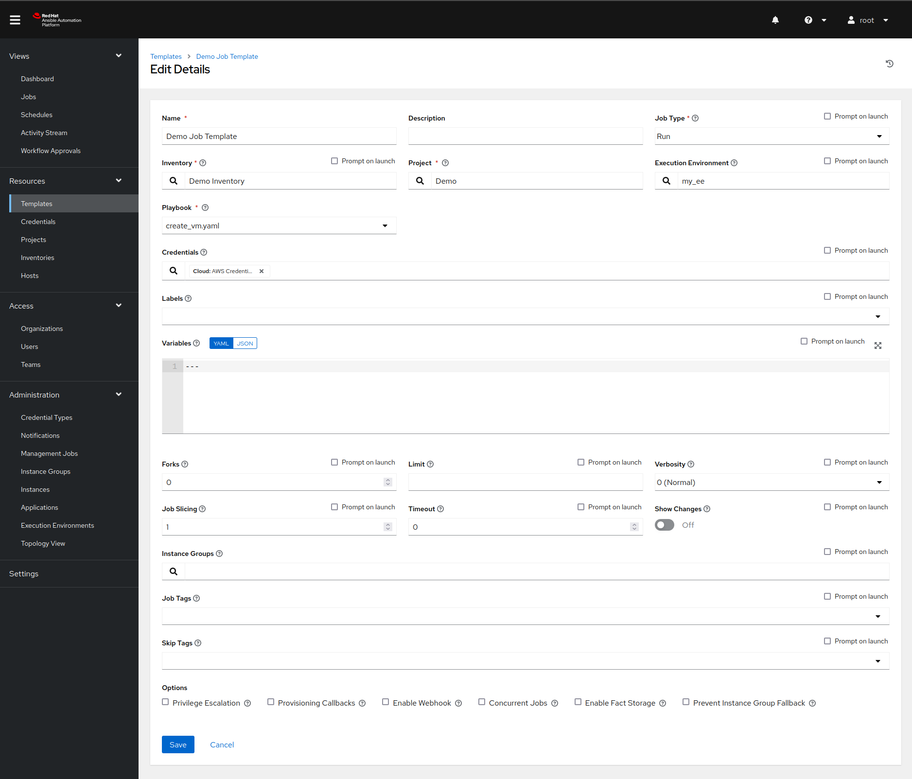 run. Job templates define what playbook the Ansible Automation Platform will execute, what