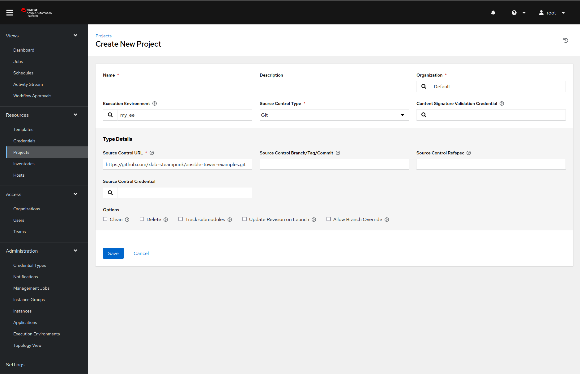 Feel free to change the configuration as you see fit, but make sure you set the SCM URL field’s value to https://github.com/xlab-steampunk/ansible-tower-examples.git and select the right Ansible execution environment, with the search button.