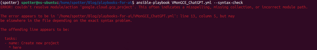 Okay, so we have the playbook, now we just fill in the values and deploy it? Not exactly, before we push it to our production, we must check the playbook if it’s secure and written well enough for the real world. We can use Ansible built-in function -- syntax-check first. Let’s see what we get. ChatGPT suggested that we need to install the google.cloud.python module, but what we really need are requests and google-auth. We install them using pip.
