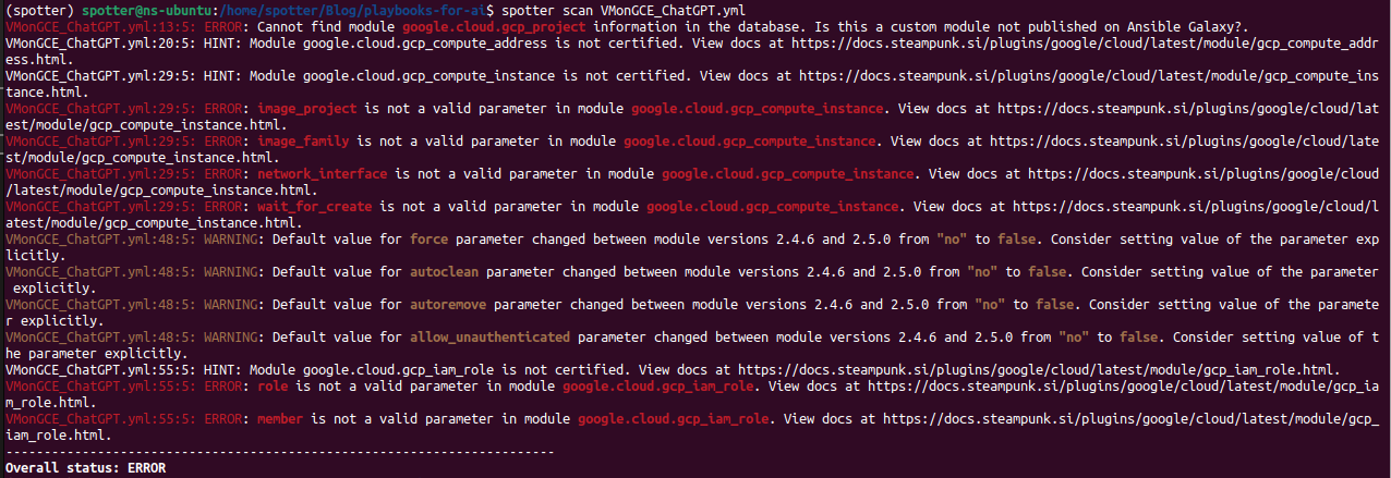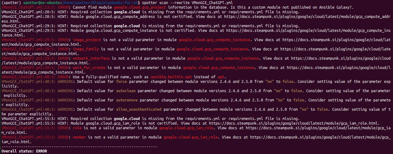 We got a lot of errors and warnings. That doesn’t mean that that’s the end of this playbook and that AI doesn’t know what it’s doing, it just means that it does need some help on the way to the finished product. Here’s where Spotter’s rewrite function comes into play: spotter scan --rewrite FIleName.yml.