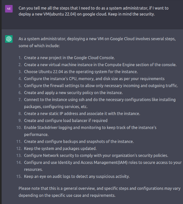 Let’s do some role-playing and imagine that we are a Windows environment administrator in an enterprise. We want to automate the deployment process of a new Ubuntu VM on Google cloud for testing purposes. We do this often but looking for all the collections and necessary steps to create a new resource group, VM specification, and so on, is very time-consuming. So, we use ChatGPT to define all the steps required for the deployment: