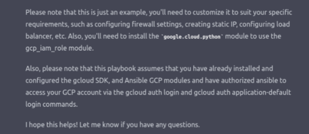 Splendid! We have all the steps written down in the first minute of exploring how and what to do to automate a deployment of a VM on the cloud. Next, we use ChatGPT to create a playbook. It’s best to go through the steps and verify that they are correct before moving on.