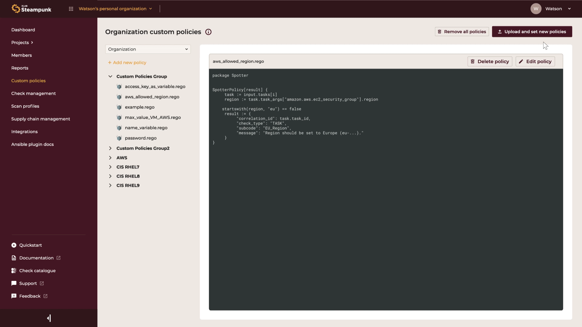 What it is: With AI-Powered Compliance Validation, you can easily apply custom policies tailored to specific compliance standards and benchmarks (like CIS RHEL and AWS) to your playbooks with just a few clicks.