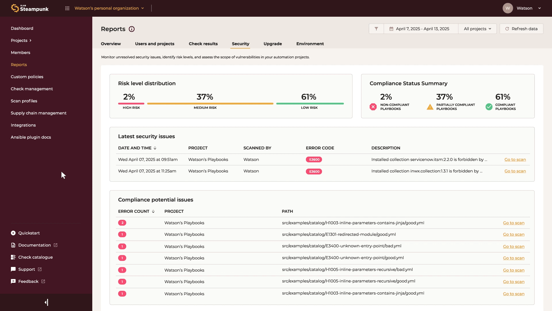What it is: For regular monitoring, the Spotter reporting platform consolidates all your scan results into a single, easy-to-navigate view, giving you a comprehensive overview of your automation landscape. Now you can also use reporting to keep an eye on security risks in your Ansible Playbooks and execution environments, monitor Ansible upgrades and environment changes, and get an overview of Ansible code quality in a comprehensive dashboard.