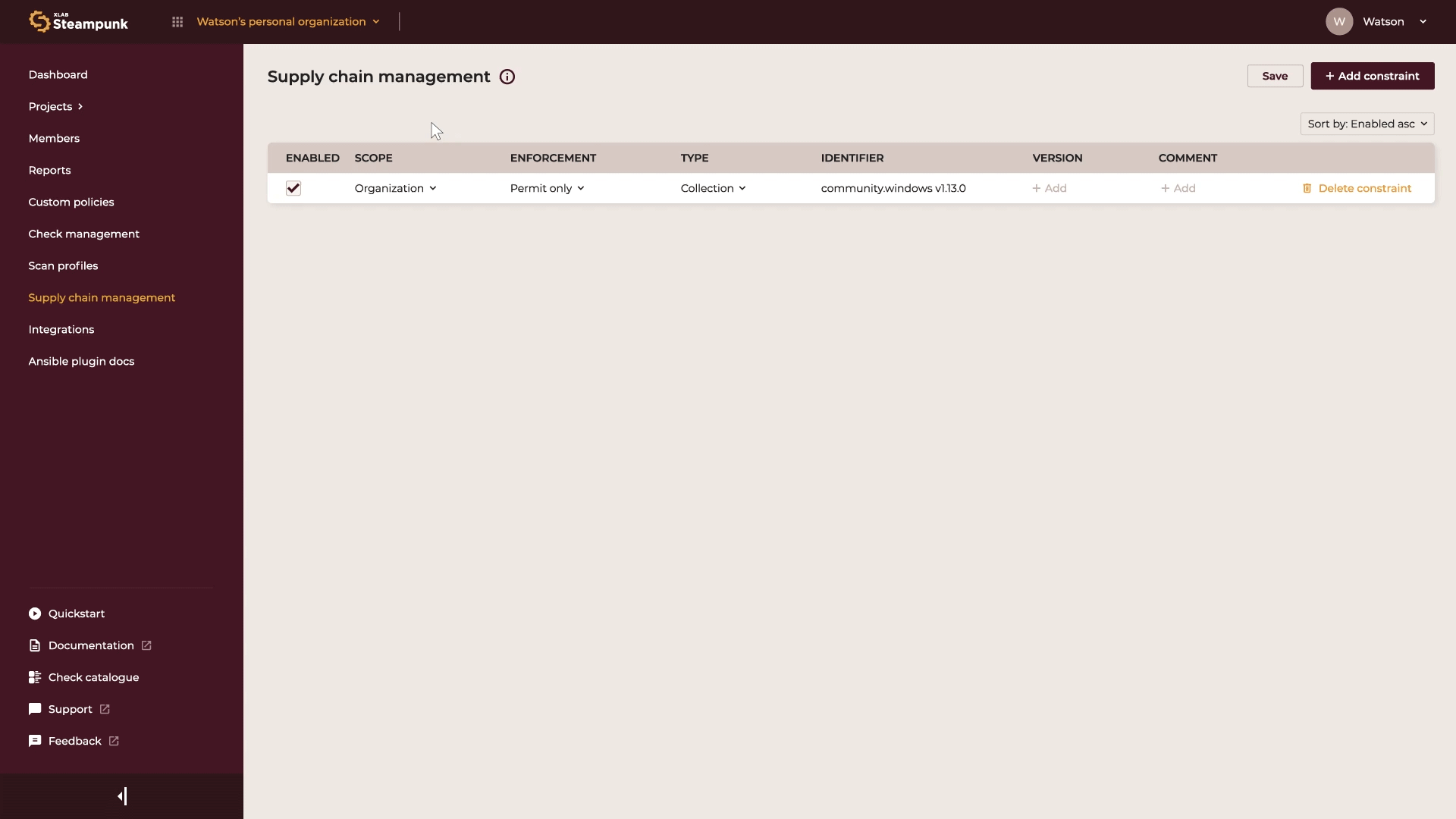 What it is: The Supply Chain Management feature allows you control which third-party dependencies of your Ansible automation are allowed to be installed or used, including blocking certain Ansible modules or collections and enforcing approved Python versions.
