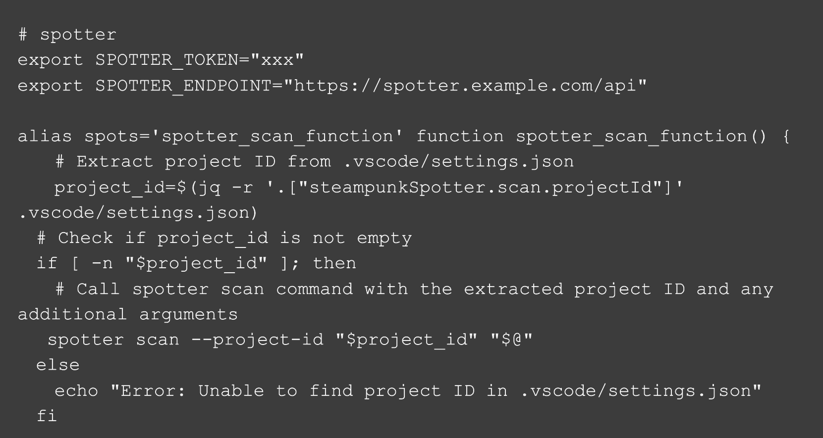 However, they also needed a solution for a command-line interface (CLI). They developed a script that facilitates scanning from the CLI by simply typing spots followed by the path to scan, along with any additional parameters normally used with Spotter. The script requires the Spotter token and endpoint, which are exported as usual. The team set an alias for spots and defined variables to extract the project ID from the VS Code config file in the repository. If no project ID is found, an error is thrown; otherwise, a Spotter scan is performed with the specified parameters.