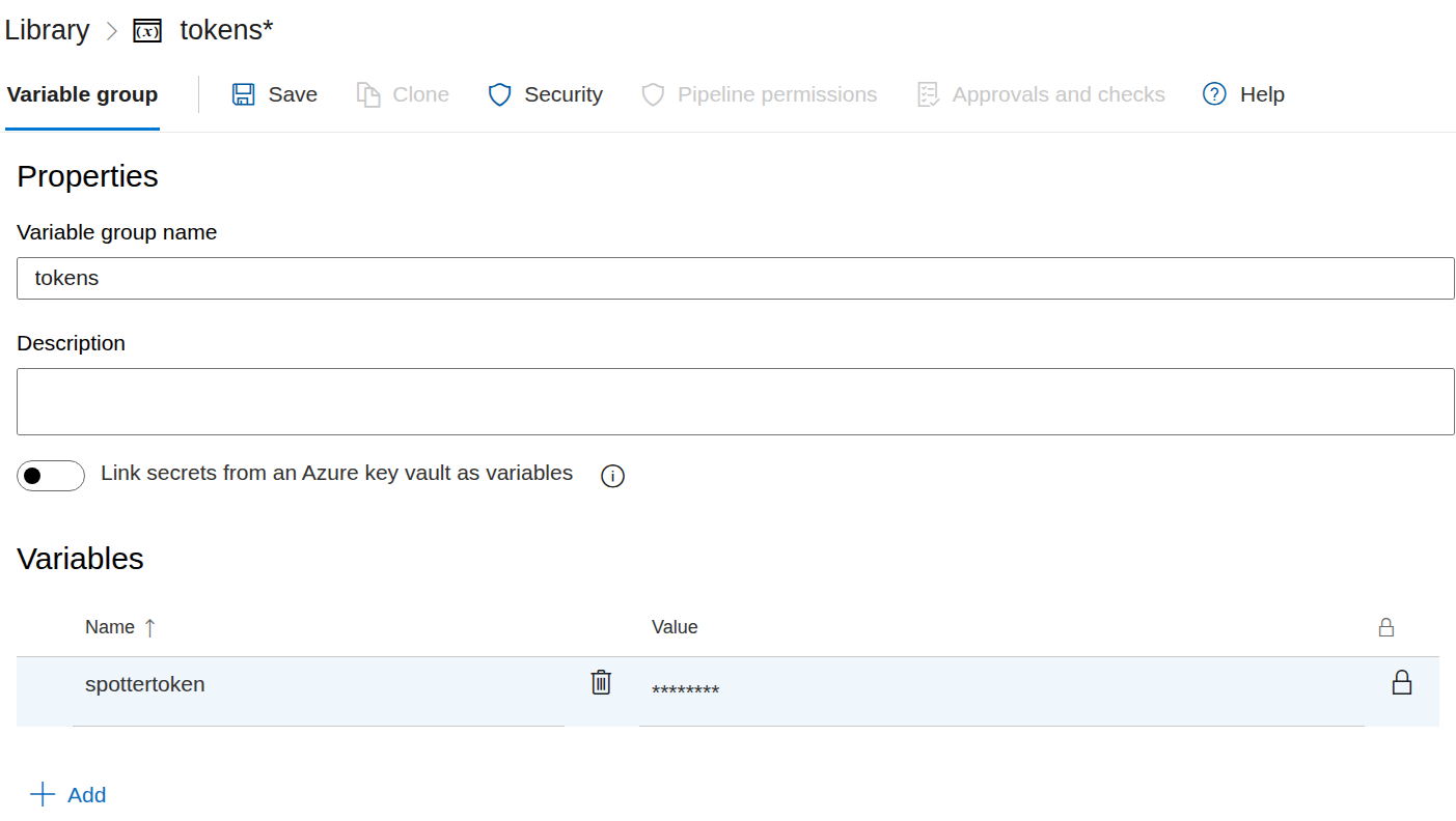 After that you go to the Pipelines and click on the Library option. Create a new group and add your token. Name it SPOTTER_TOKEN and paste in the token you generated in the step before.