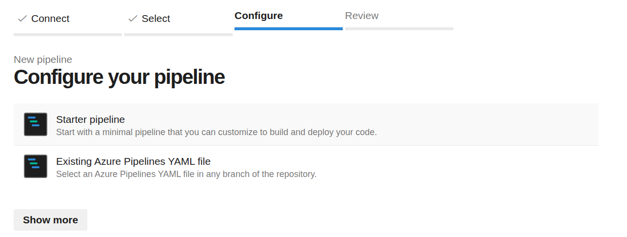 Choose Azure Repos Git as your code source, select the repository we’ve just set up, and then go with the Starter pipeline option.
