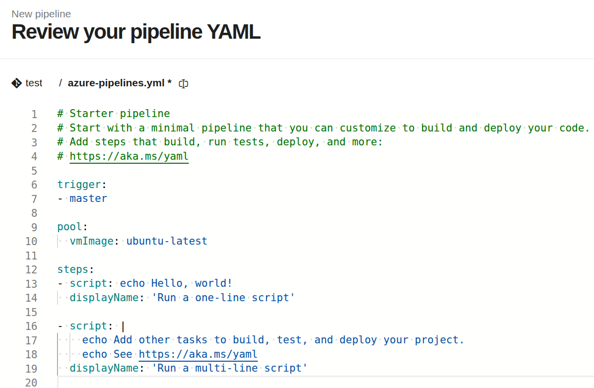 You’ll be presented with a basic YAML pipeline configuration. You can go ahead and paste the following configuration into the generated code.
