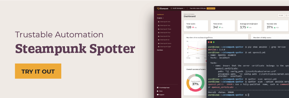 With a bunch of new checks and features added, Scanner actually grew so much, it outgrew its name. It evolved into Steampunk Spotter , indispensable tool that analyzes and enhances your Ansible Playbooks to help you reduce risks and speed up your automation.