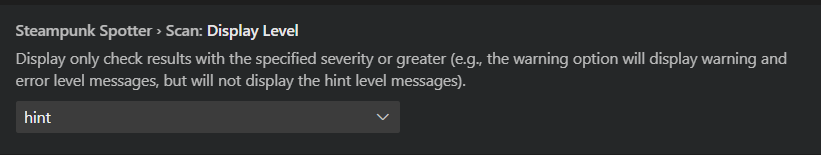 Display level: The display level determines the level of scans. For example, setting it to “warning” will suppress hints.