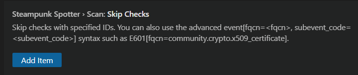 Skipping Checks: If you want to skip specific checks, you need the ID of the check you wish to omit. You can find the check ID in the check catalogue within the Spotter app. Add the check ID to skip it during the scanning process.