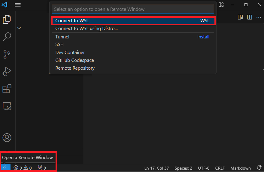 Your Visual Studio Code has to run in WSL. To use WSL within VS Code, just open Visual Studio Code, hit the Open a Remote Window icon at the bottom left, and choose Connect to WSL from the top menu. You’ll be all set to use Linux tools and files right from VS Code!
