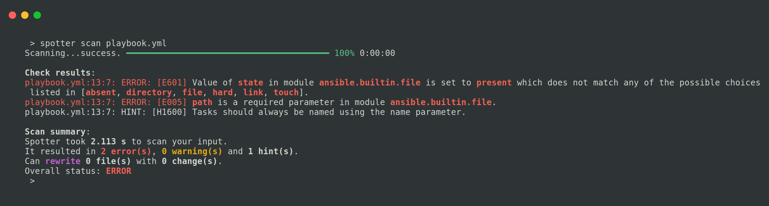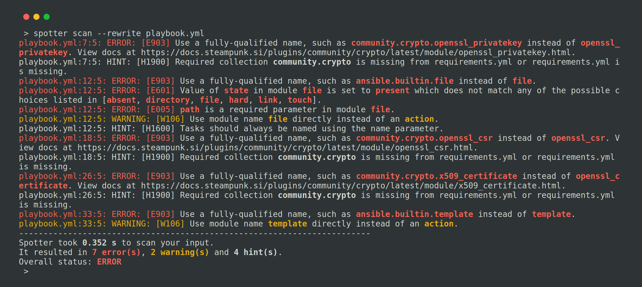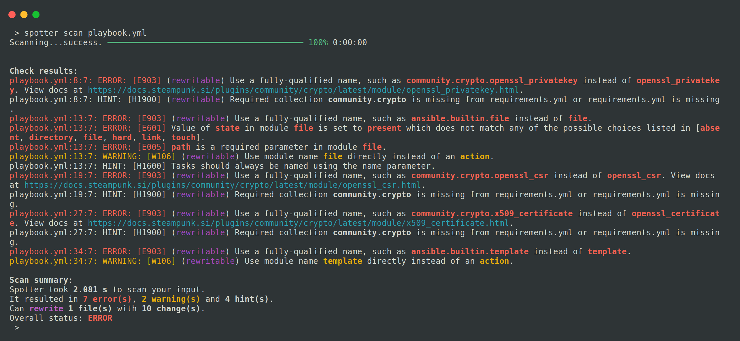 By running the Spotter command on our Ansible Playbook, we receive valuable feedback and suggestions for improving our playbook.