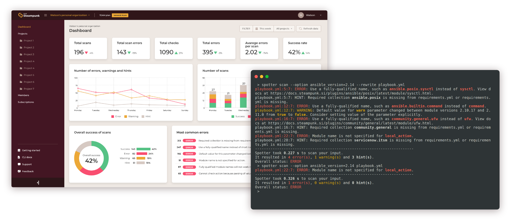 Whether you scan your content via CLI, the app, or in GitHub, GitLab and VS Code, you can track the results of all your scans in the Spotter app The app provides an intuitive dashboard where you can keep up with your scan history, the frequency of failed playbook executions, most common mistakes and your progress over time.