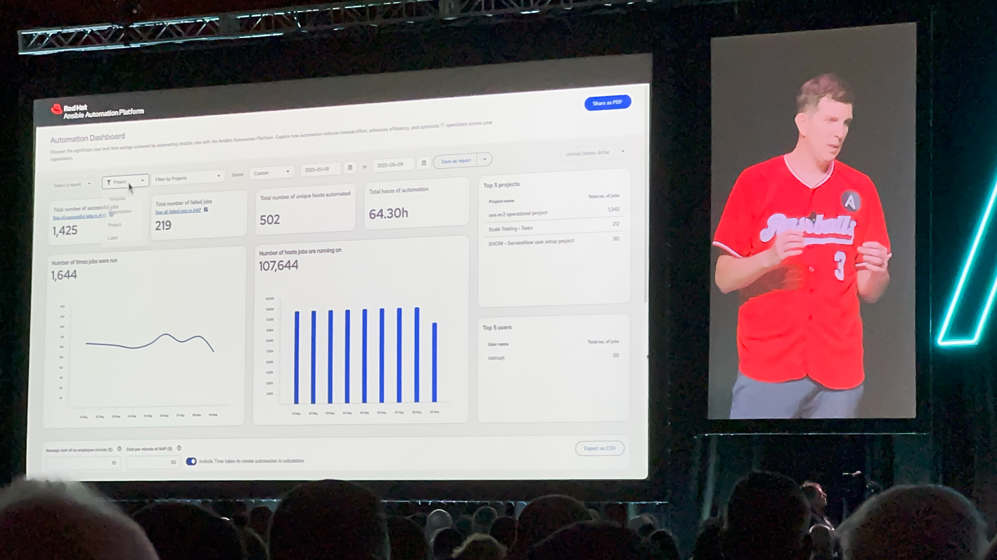 The keynote continued with the introduction of the new Automation Dashboard by Sean Cavanaugh (Red Hat) and Kaete Piccirilli (Red Hat). The dashboard provides a tangible way to communicate the impact of automation on the business from time savings to cost reductions. We’re proud to have collaborated with the Ansible team to bring this vision to life to deliver the biggest wins—turning insights into action.