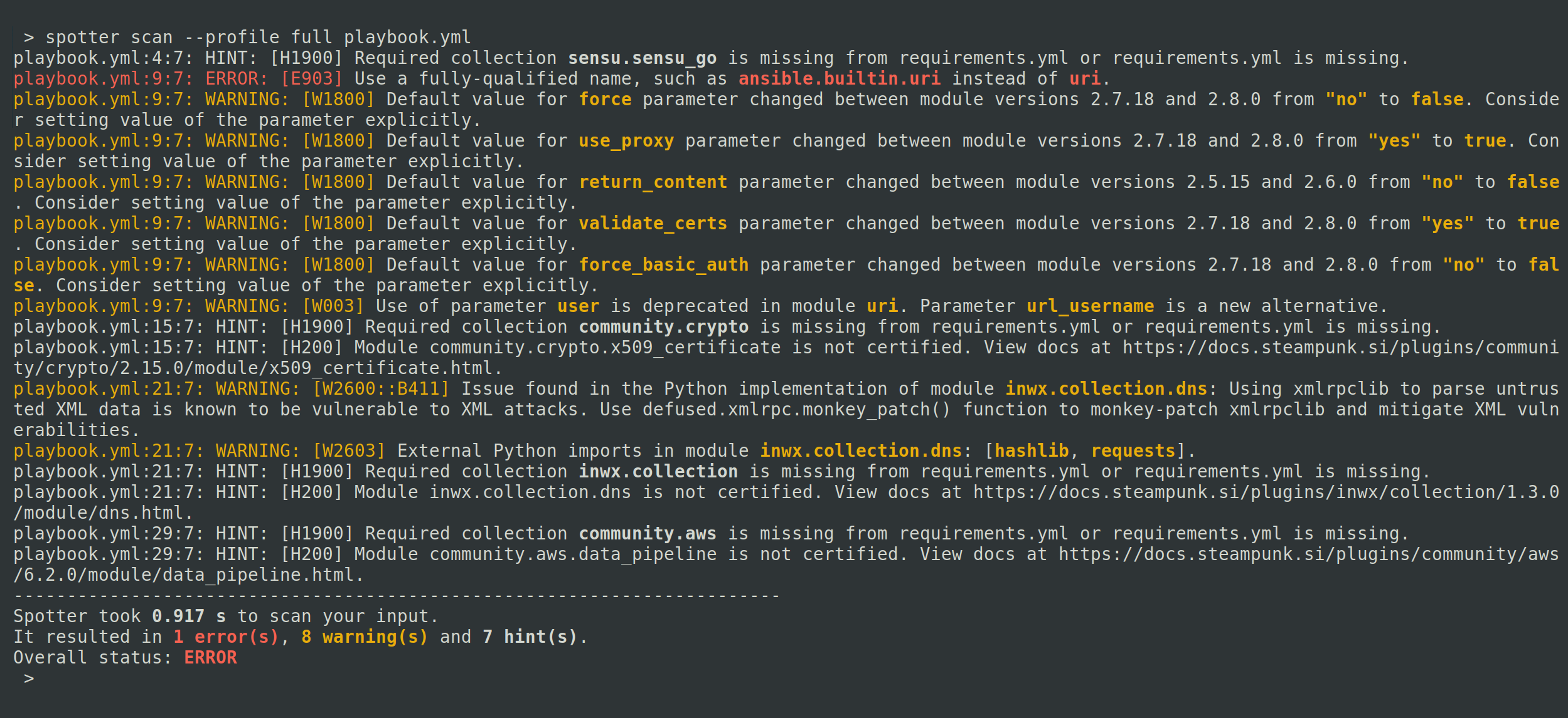 The complete profile encompasses all the checks Spotter has to offer, including upgrade-related and complete security related checks. This profile proves invaluable when tackling Ansible upgrades, helping you update your Ansible Playbooks to work with the newest or specific Ansible version. For instance, it allows you to see changes in default parameter values between module versions or check the relevant for migration to the Ansible Automation Platform and execution environments.