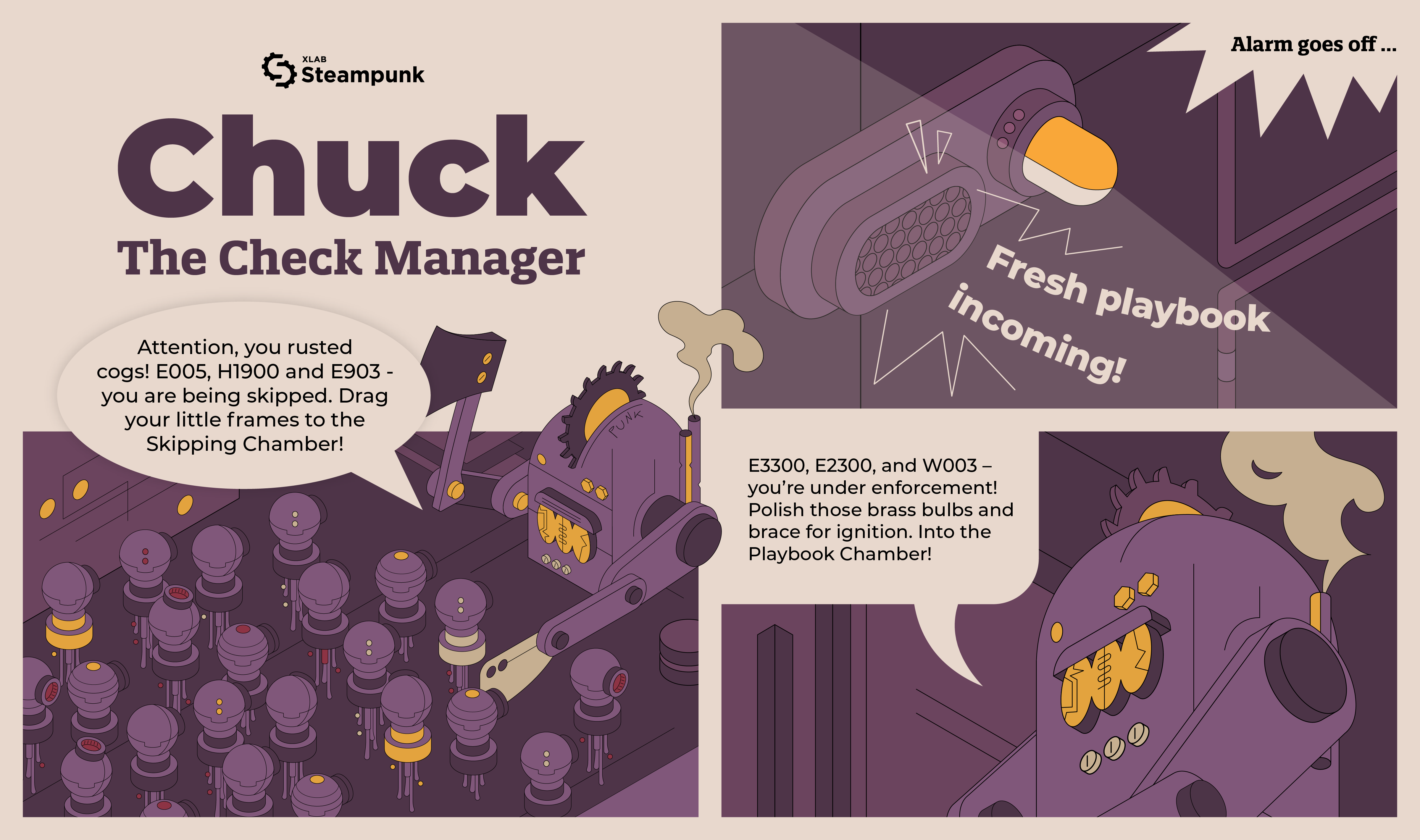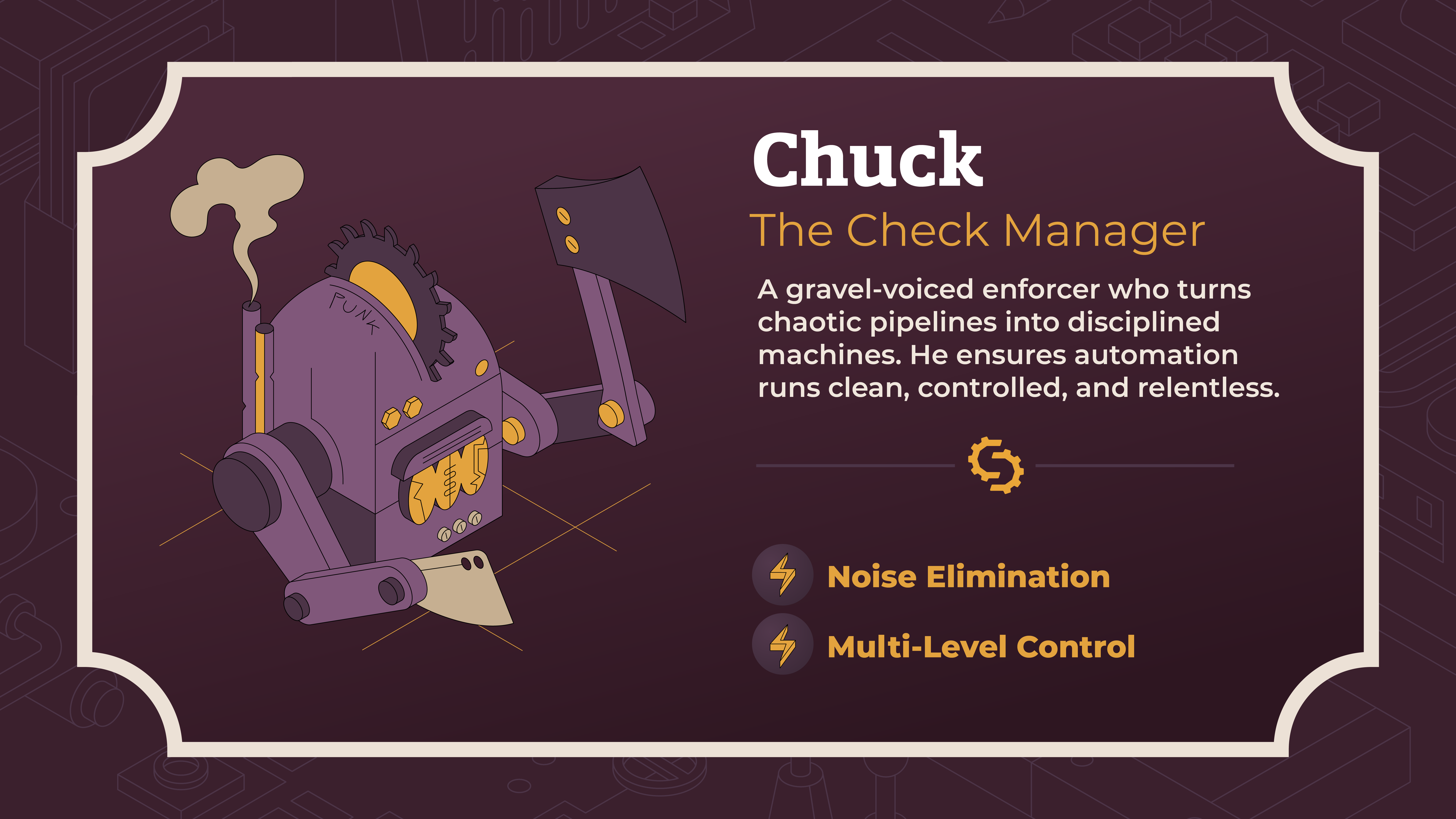With gravel in his voice, an axe in his hand, and a perpetual scowl that hides a wicked sense of humor, Chuck is the boss of every check that runs through Spotter. He is the one who keeps the system clean, in the grittiest way possible. Every automation engineer knows the moment: a pipeline throws 43 “warnings,” 19 “notices,” and 3 “errors,” and suddenly the only logical question is: “Which of these do I actually care about?” That is exactly the moment Chuck was made for. If anyone can enforce order in this mess, it is him.