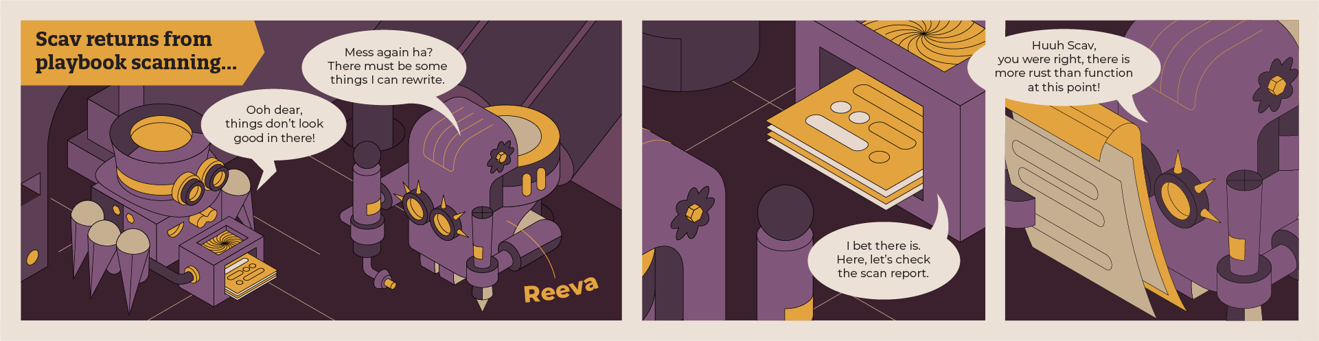 When broken or outdated code shows up in a scan, Reeva welds her way in. She is the master of automatic playbook rewrites. Reeva slices though the chaos of playbooks, knits broken logic back together, rewrites code to the latest standards. When the crew needs perfection, they turn to her.