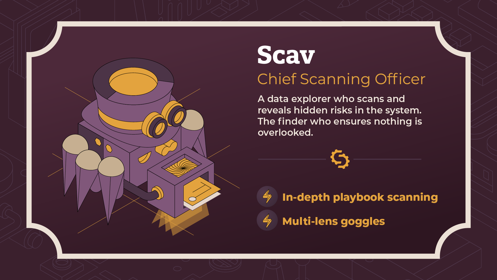 Scav lives in a world of playbooks and precision. With his multi-lens scanning goggles, he doesn’t just look, he dives deep. One minute he’s checking a fresh update in your Git repo, the next he’s digging through an old playbook to find a tiny bug that could cause big problems.