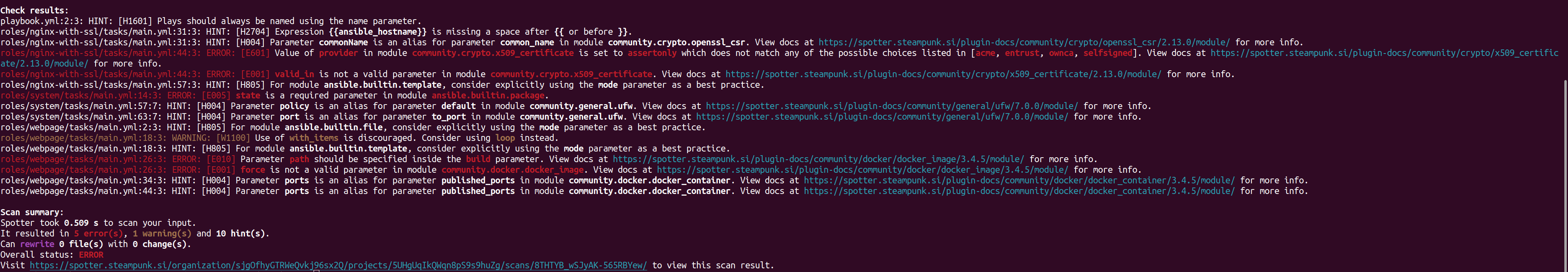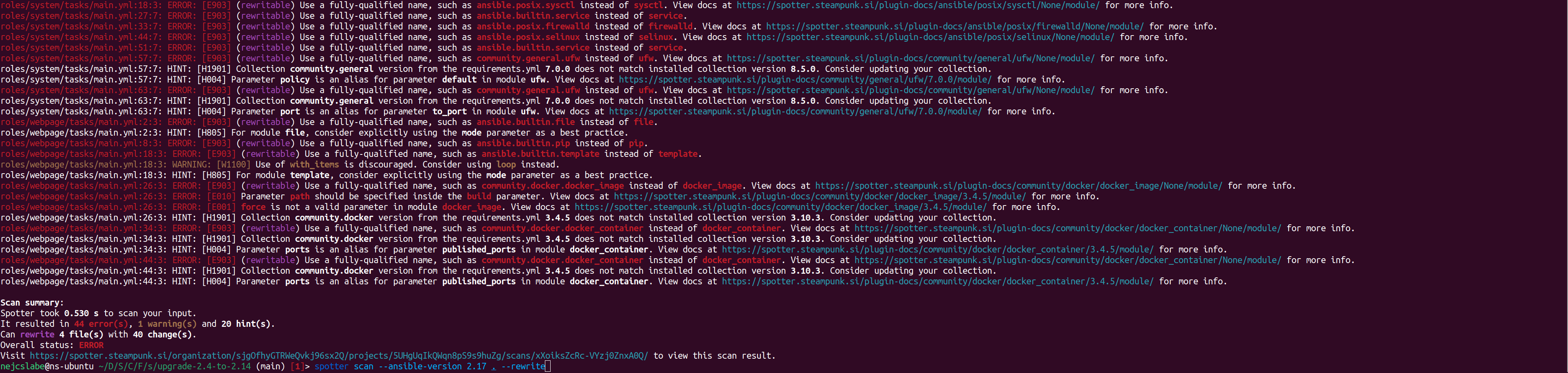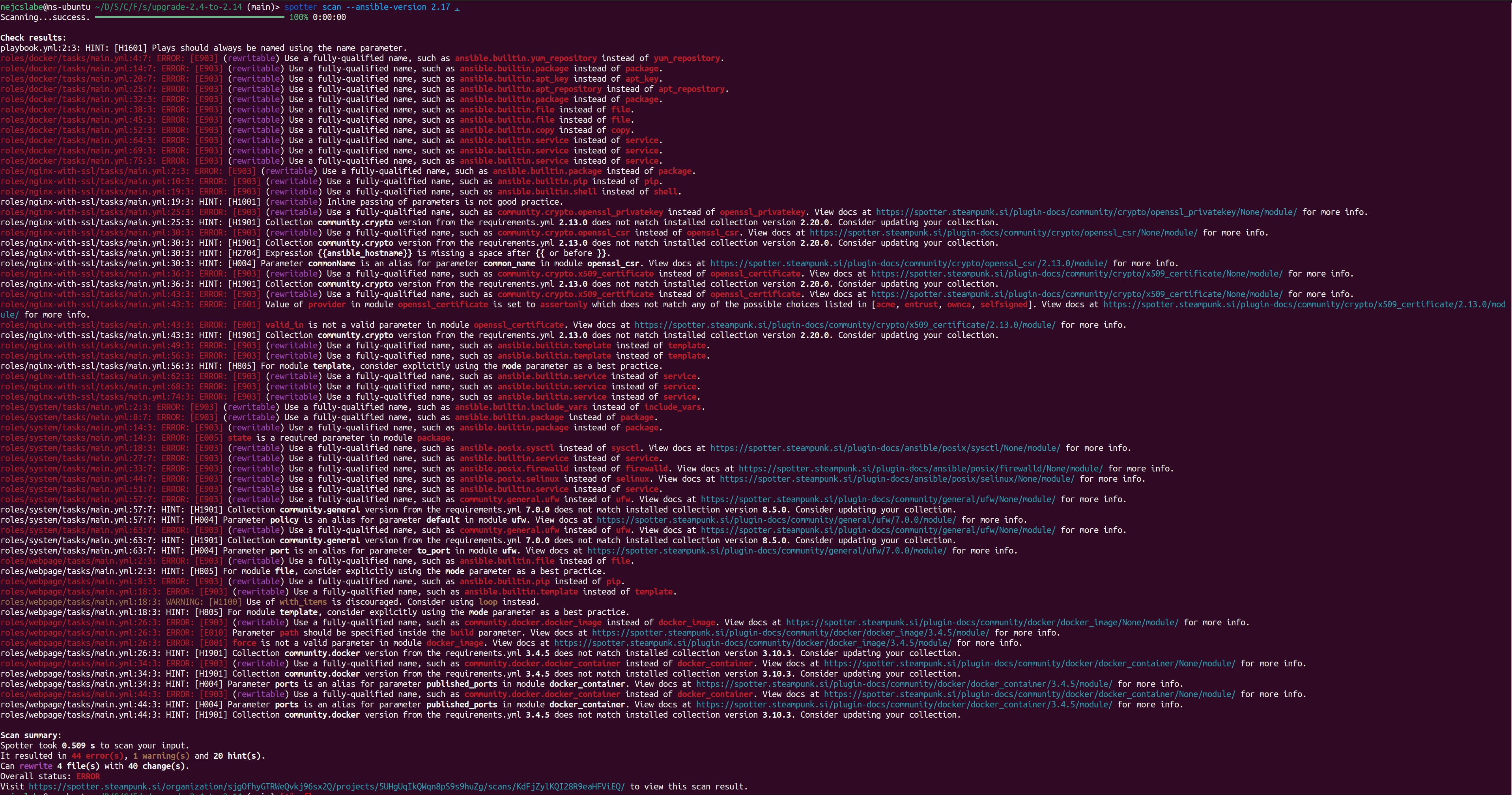 After automatically fixing FQCNs and manually fixing remaining mistakes, it’s time to run spotter scan -o ansible_version=2.17 once again, to catch any potential errors that may have remained.