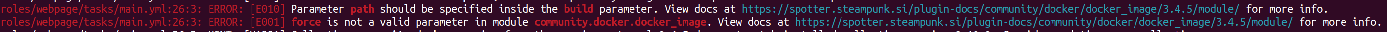 But some errors require a little more work. For example, we encountered this error when scanning our playbook: path and force are not valid parameters in the community.docker.docker_image module.
