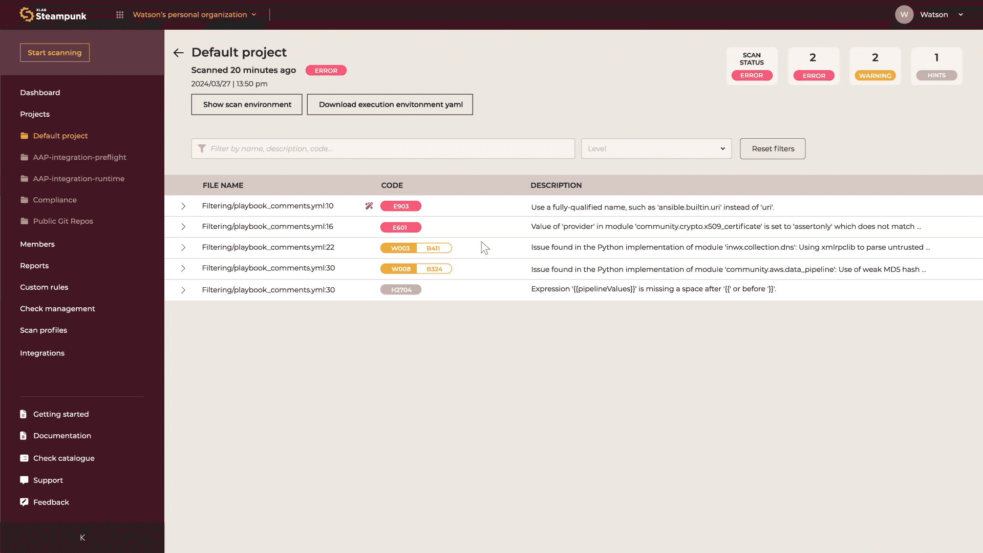 Spotter thoroughly analyses your playbooks and offers three levels of warnings, depending on the severity of found issues: errors, warnings and hints.
