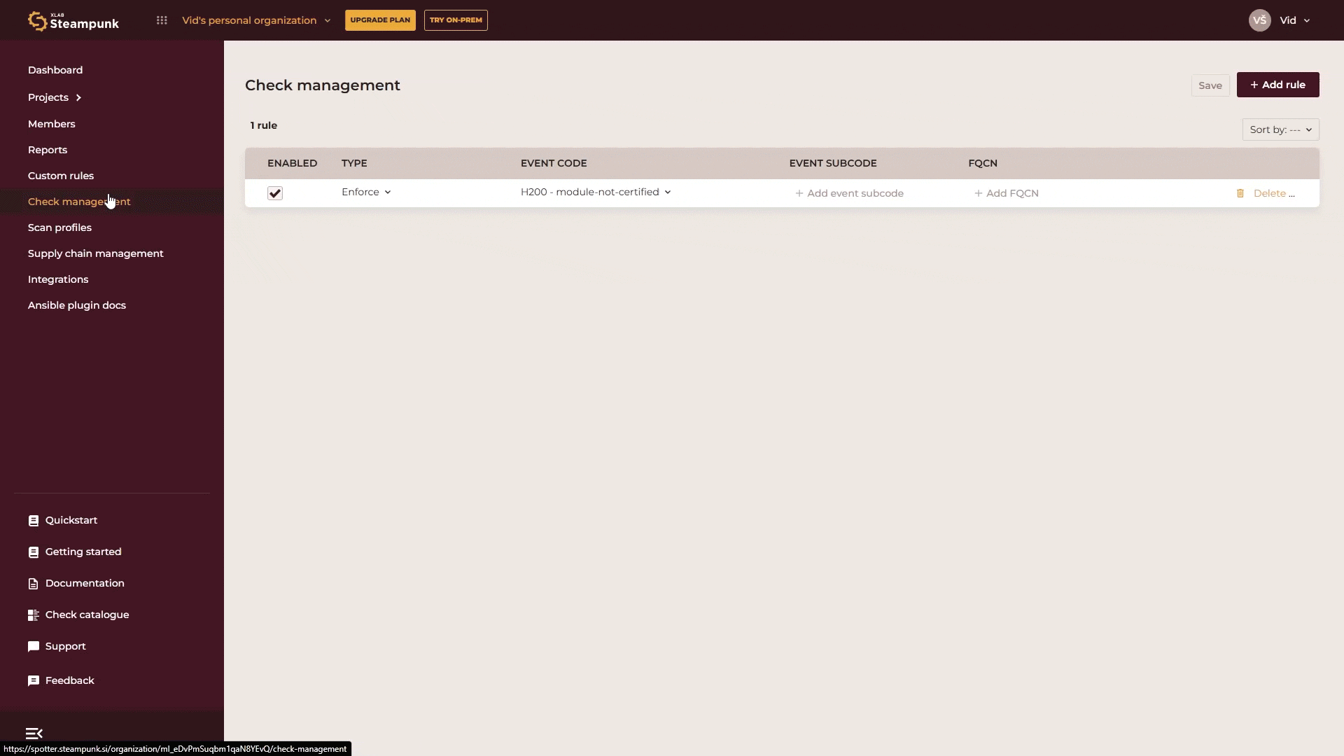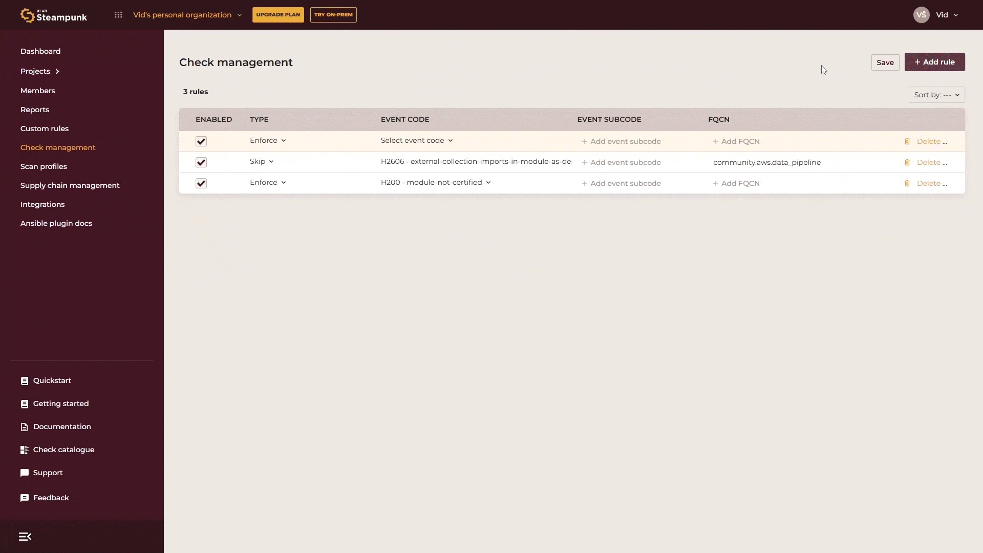 Organization admins can enforce or skip checks organization-wide with just a few clicks in the Spotter App. Any checks enforced at this level can’t be ignored when scanning by any user in your organization. Go to Check management, click Add rule, select whether you want to skip or enforce the check, enter the check code or search for it by name, and click Save.